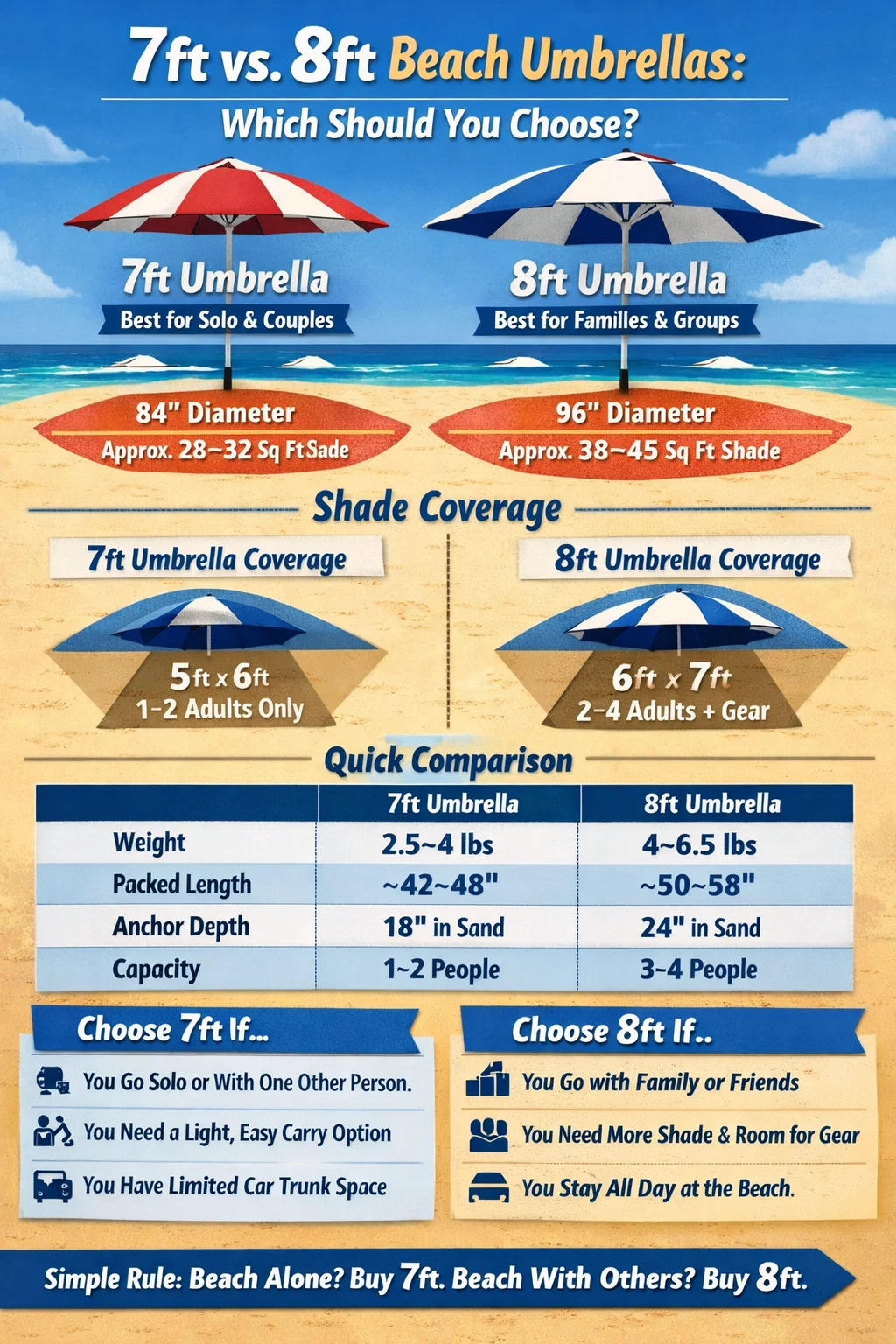 Если вы покупаете пляжный зонт и задаетесь вопросом, какой размер — 7 футов или 8 футов — лучший выбор, вот прямой ответ: Пляжный зонт длиной 8 футов лучше подходит для групп из 3 и более человек, а зонт длиной 7 футов — более разумный выбор для отдельных лиц или пар, которые отдают предпочтение портативности. Разница в диаметре навеса между этими двумя размерами приводит к значительному разрыву в полезной тени — и этот разрыв имеет значение, когда вы пытаетесь сохранить прохладу всей своей семье в жаркий летний день.