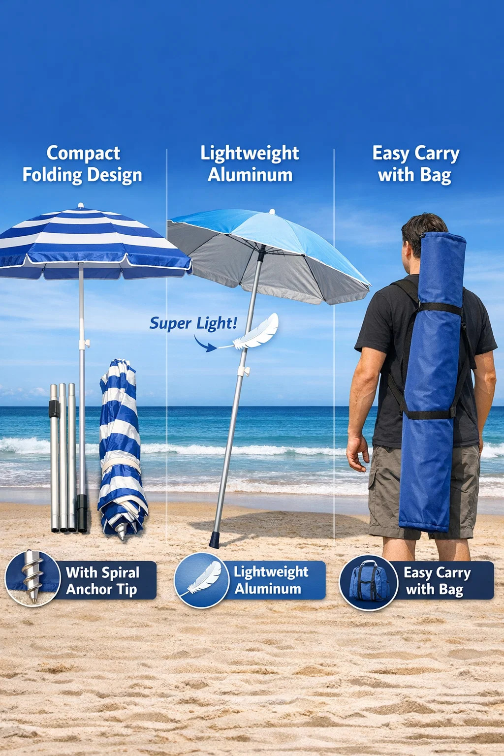 Преимущества: Этот тип пляжного зонта не только устойчив к ржавчине, но и чрезвычайно легок, что позволяет носить его одной рукой. Это очень удобно для тех, кому необходимо перевезти снаряжение со стоянки на пляж.