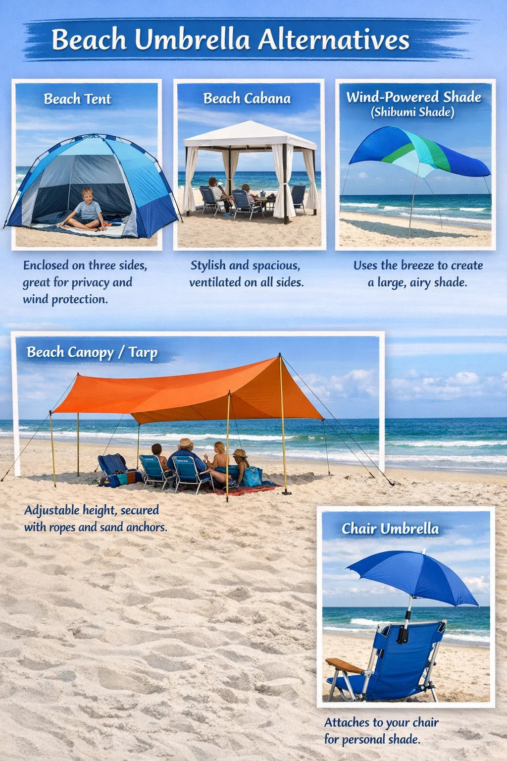 Если вам сложно носить или устанавливать пляжный зонт или вы беспокоитесь о том, что его унесет ветер, на рынке доступно множество более устойчивых альтернатив с большей затененной площадью.