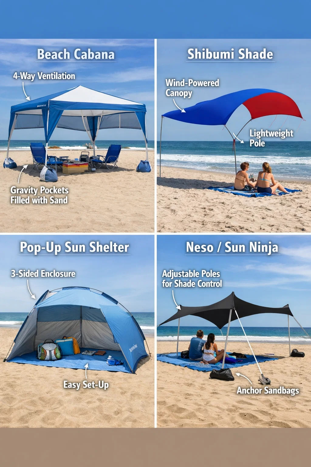 Пока пляжные зонтики являются классическими, если вы ищете более стабильную, просторную или современную защиту от солнца, следующие варианты обеспечивают превосходную защиту во многих отношениях: