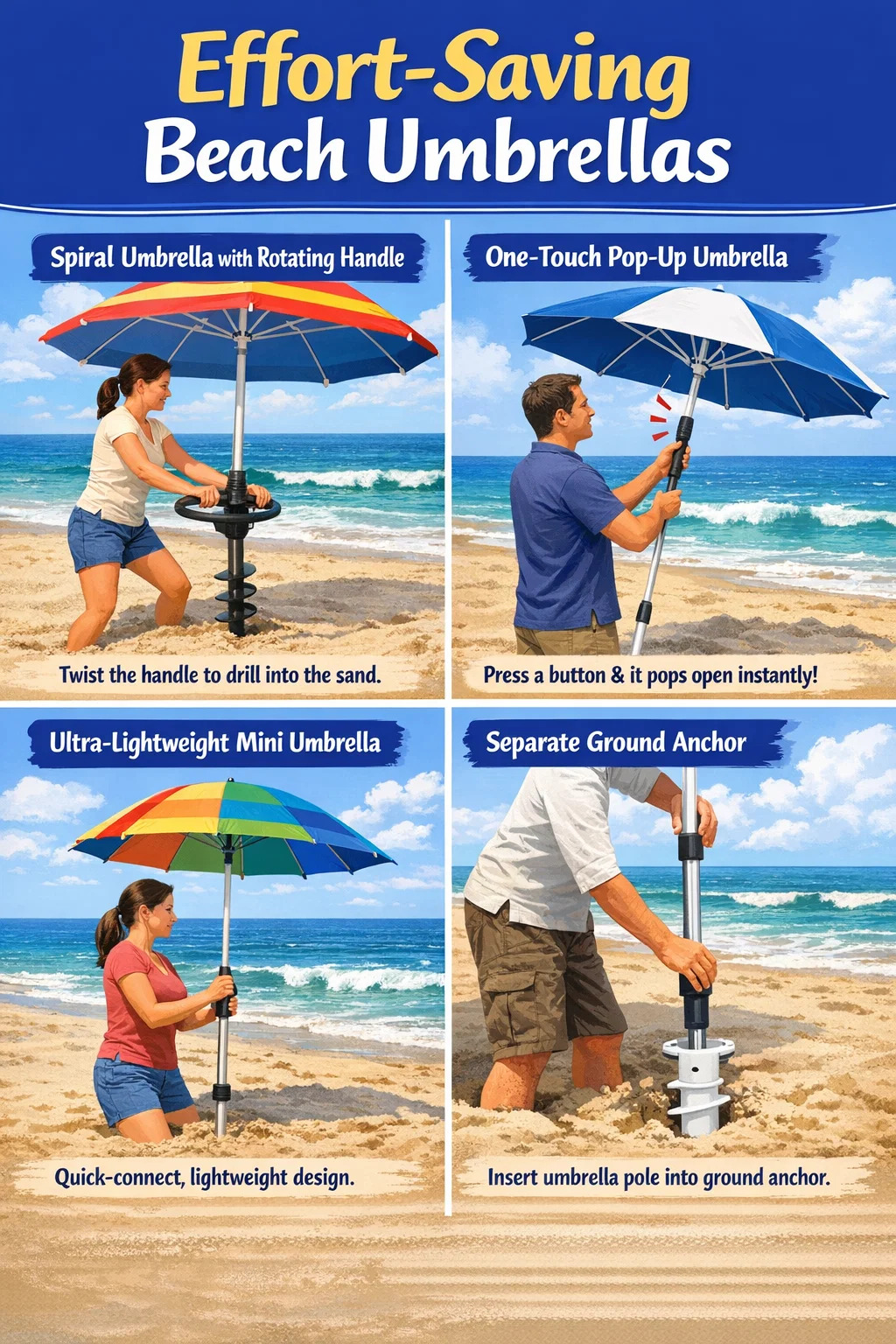 Если вы ищете пляжный зонт, установка которого не требует геркулесовых усилий, то конструкция, позволяющая «одним касанием» или «экономящая усилия», определенно является лучшим выбором.