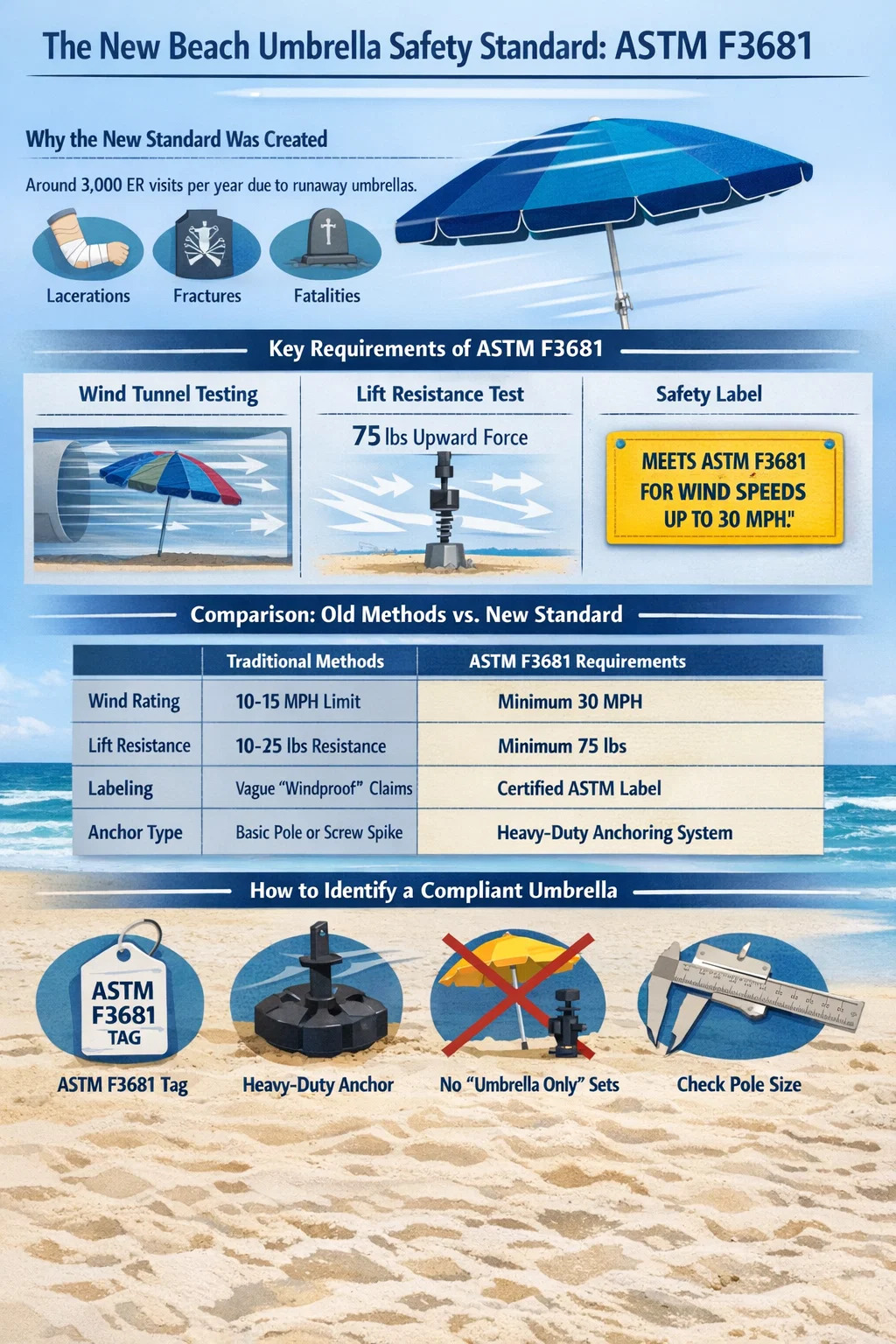 На протяжении десятилетий дизайн пляжный зонтик оставался практически нерегулируемым, что приводило к тысячам травм каждый год. Данные Комиссии по безопасности потребительских товаров (CPSC) показали, что примерно Ежегодно в отделениях неотложной помощи проходят лечение 3000 человек. из-за травм, вызванных сбежавшими зонтиками. В этих инцидентах зонт часто превращается в опасный снаряд при внезапных порывах ветра, что приводит к рваным ранам, переломам и даже гибели людей. Стандарт ASTM F3681 был разработан, чтобы стимулировать переход отрасли к научно проверенным механизмам крепления.