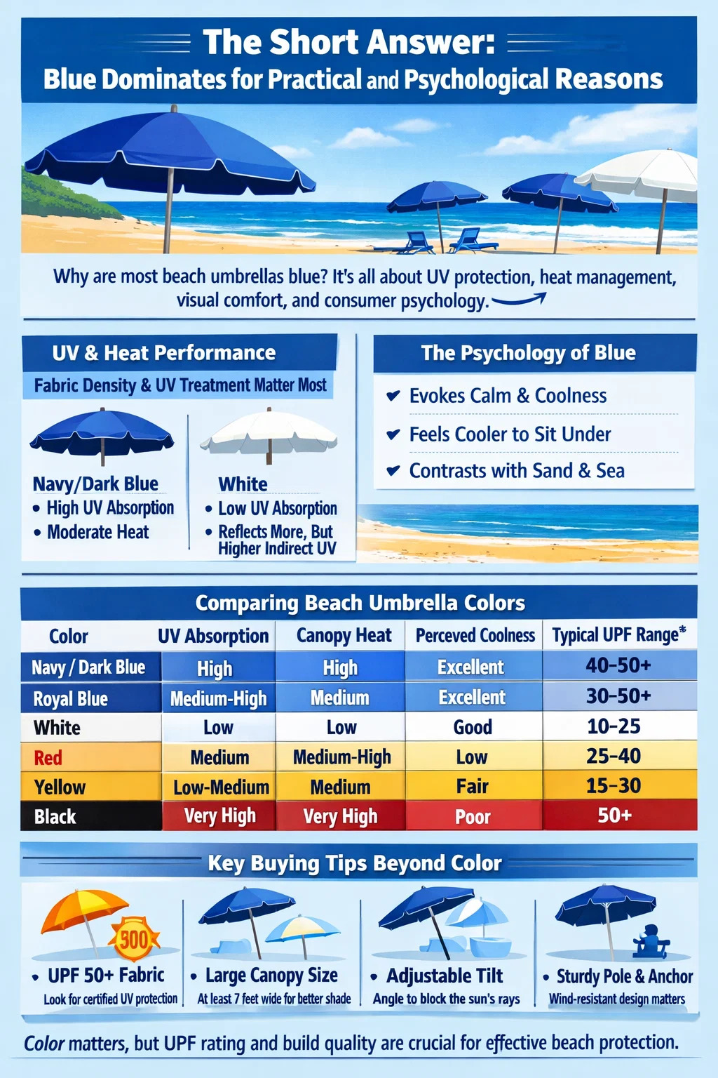 Прогуляйтесь по любому пляжу — от Майами до Средиземного моря — и вы заметите, что синий — самый распространенный цвет пляжных зонтов. Это не случайно. Голубые пляжные зонтики стали доминирующими благодаря сочетанию защиты от ультрафиолетового излучения, тепловых характеристик, визуального комфорта и коммерческих традиций, которые складывались десятилетиями. Но цвет сам по себе не расскажет всей истории. Переплетение ткани, технология покрытия и диаметр купола имеют такое же значение, как и оттенок, который вы выбираете со вешалки.